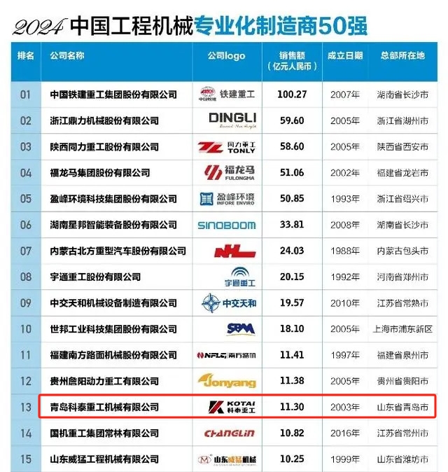 10月15日,“2024中国工程机械专业化制造商50强”“榜单在湖南长沙发榜,开云官方站官网重工成功入选,排名第13位。